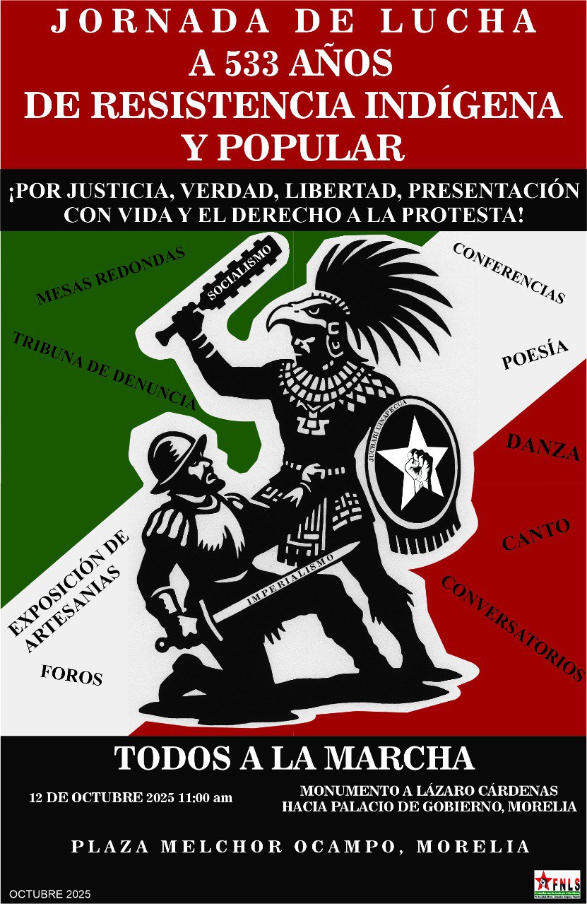 Informamos al pueblo de Michoacán, México y allende las fronteras que las comunidades indígenas-campesinas y sectores populares organizados en el Frente Nacional de Lucha por el Socialismo (FNLS) estamos desarrollando la Jornada de Lucha a 533 Años de Resistencia Indígena y Popular por: Justicia, Verdad, Libertad, Presentación con Vida y el Derecho a la Protesta; en la cual mantenemos en alto la demanda de (…)
