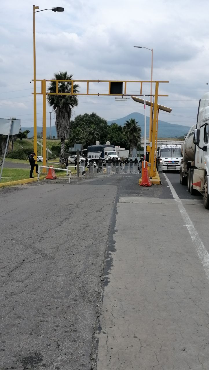 Elementos policiacos se posicionan cerca de nuestra actividad en la caseta de Panindicuaro y desde su formación amenazan a nuestros compañeros con desalojarlos.